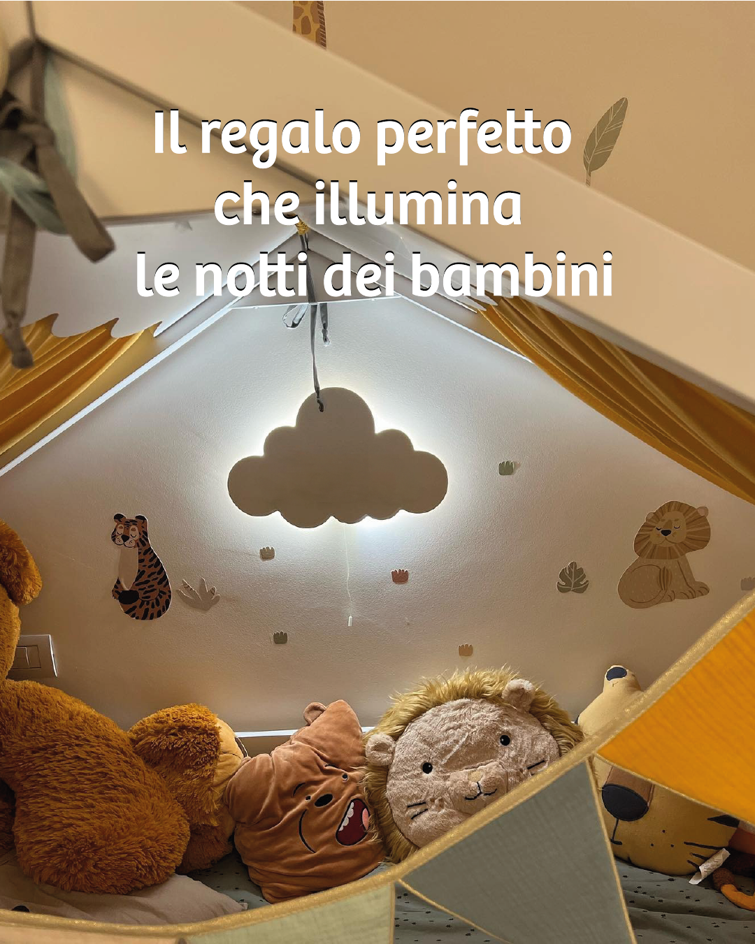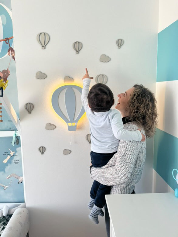 La lampada arriva pronta per il montaggio a parete. Nel retro è presente l’asola per il fissaggio: basta un tassello e una vite. Peso leggero in MDF, alimentazione a batteria 12V quindi niente cavi in vista. Consigliamo altezza 120–140 cm dal pavimento per camerette.